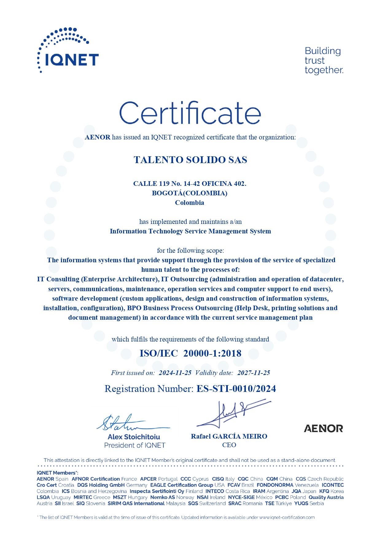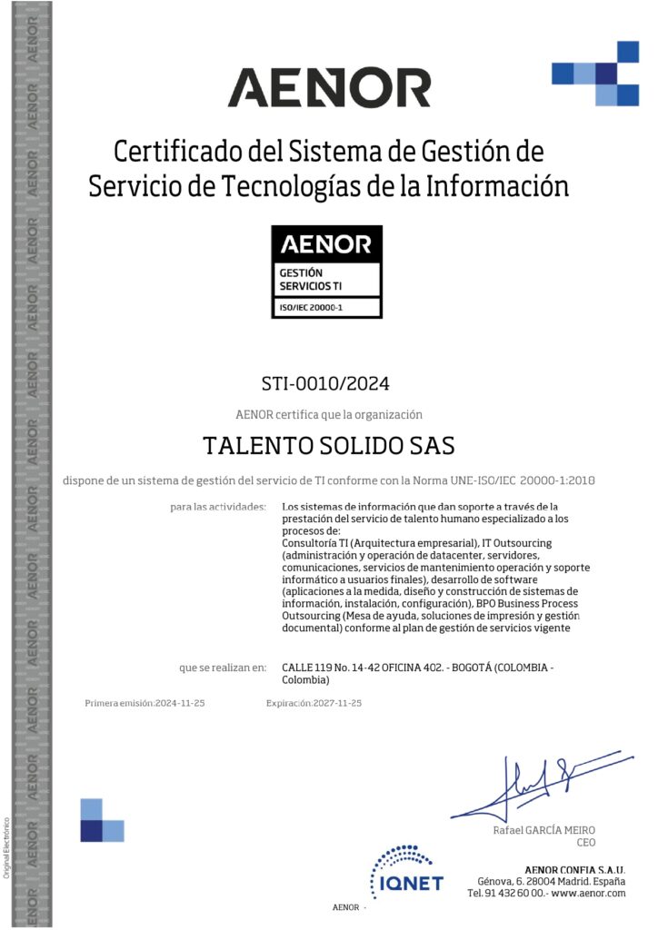 dispone de un sistema de gestión de servicios de TI conforme con la Norma ISO/IEC 20000-1:2018