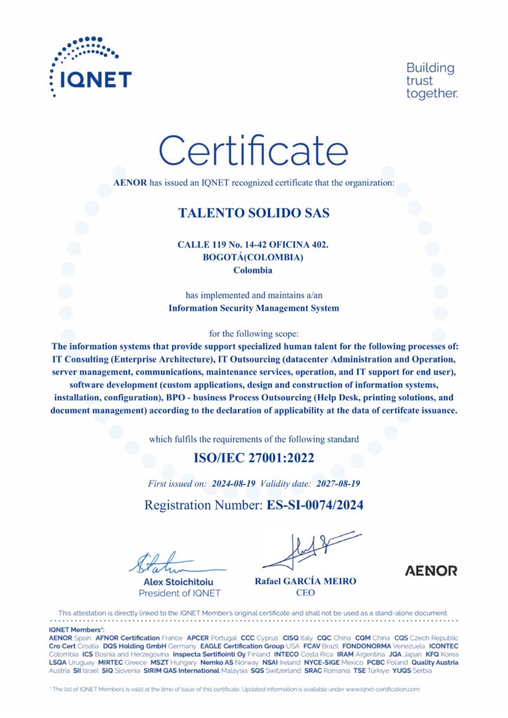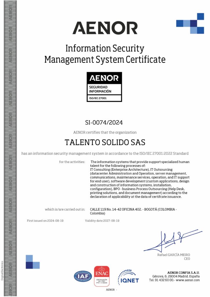 dispone de un sistema de gestión de seguridad de la información conforme con la Norma ISO/IEC 27001:2022